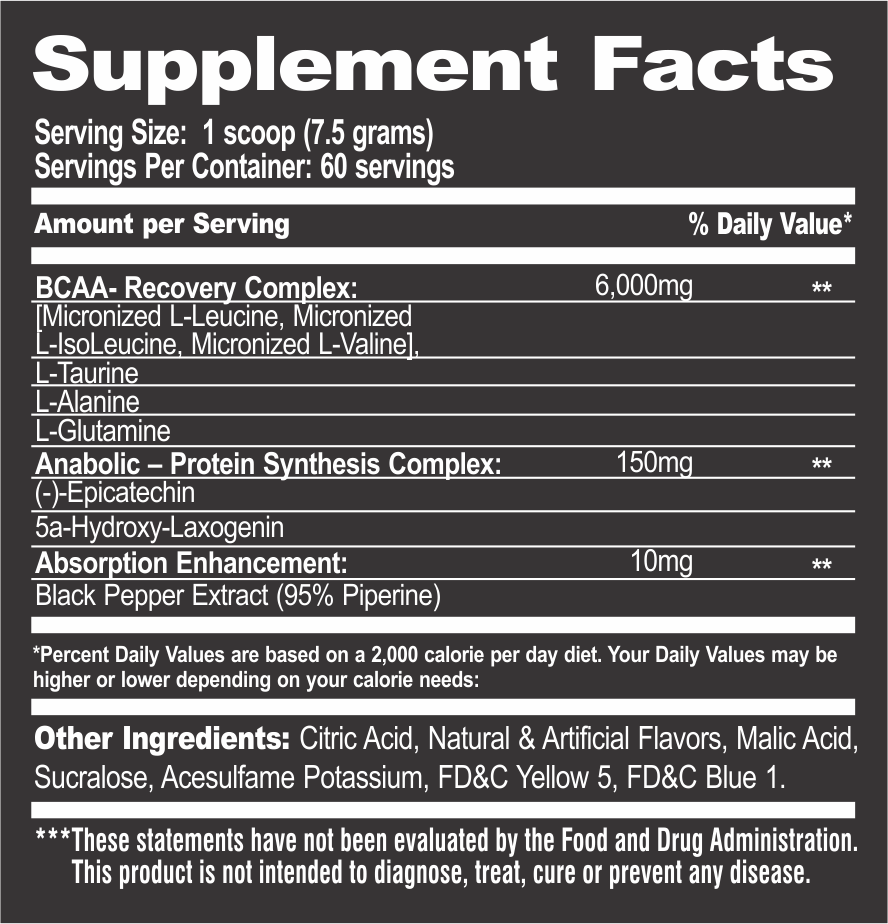 Ingredients: BCAA Recovery Complex (micronized L-leucine, micronized L-isoleucine, micronized L-valine), L-taurine, L-alanine, L-glutamine, Anabolic Protein Synthesis Complex (epicatechin, 5α-hydroxylaxogenin), Absorption enhancement; piperine, citric acid, natural and artificial flavors, malic acid, sucralose, acesulfame-K, red # 40.