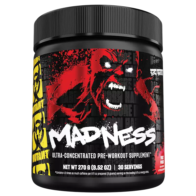 Madness-tehonlisääjä on suunniteltu kovaa harjoitteleville jotka toivovat tehokasta pumppia, pidennettyä kestävyyttä ja räjähtävyyttä kovaan harjoitteluun. Mutant on valikoinu tarkasti valikoiman ainesosia kuten argiinia, sitrulliinia, beta-alaniinia sekä kreatiinia jotta aikaansaadaan tehokas ja toimiva tehonlisääjä.