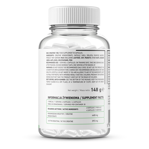 Ingredients: creatine monohydrate, capsule shell (gelatin, purified water). The product may contain residues from milk, soy, wheat, eggs, sesame seeds and shellfish.