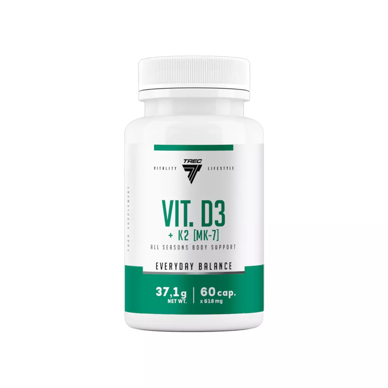 Trec Nutrition Vit D3 + K2 (MK-7) is a combination of vitamins D3 and K2, where vitamin D contributes to the maintenance of a normal skeleton and the normal function of the immune system, and vitamin K contributes to the maintenance of a normal skeleton.