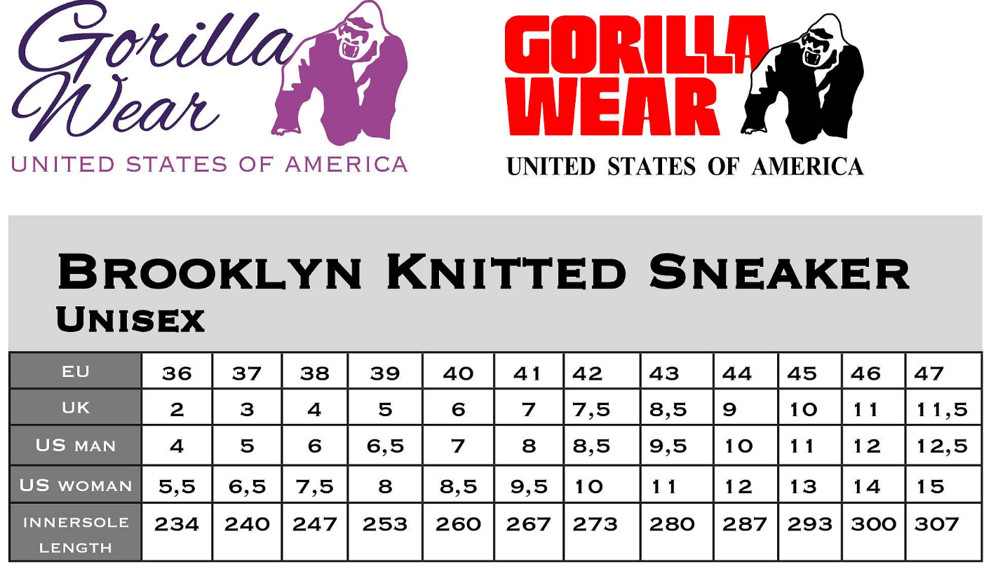 Gorilla Wear Brooklyn knitted sneakers unisex treenikengät niin vapaa-aikaan kuin harjoitteluun.Nämä kengät ovat täydellinen kombinaatio teknologiaa ja designiä. Muotoilu on ainutlaatuinen ja tyylikäs, jonka ansiosta jalkasi saavat tarvitsemansa tuen samalla näyttäen todella upeilta. Tämä laadukkaasta materiaalista ja tarkasti neulotusta kengästä on saatu erittäin kevyt, joten se soveltuu loistavasti harjoitteluun ja juoksuun.