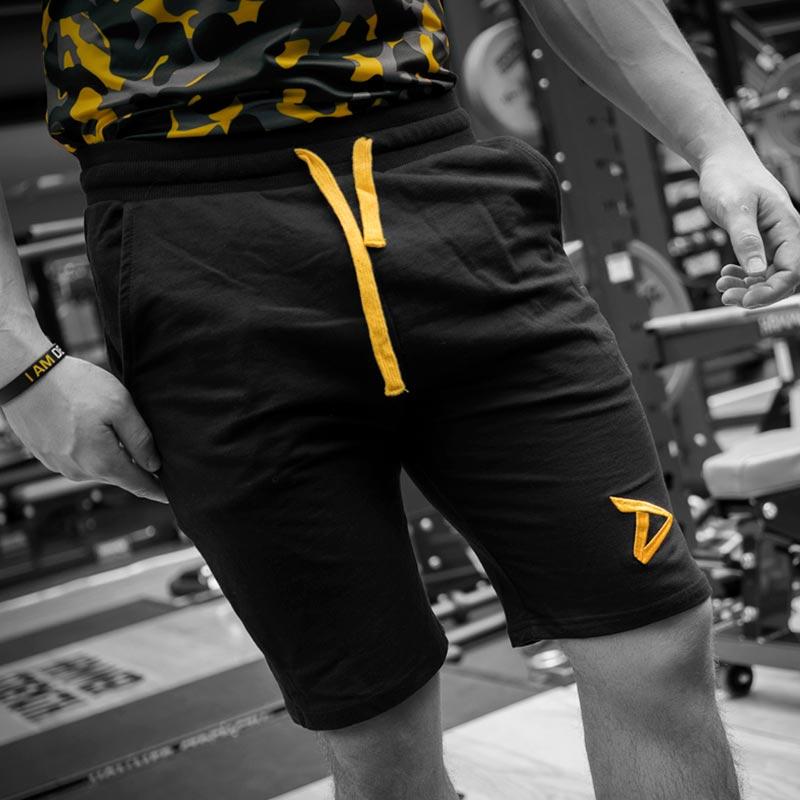 Highly-durable sweat shorts with side pockets and yellow drawstring.