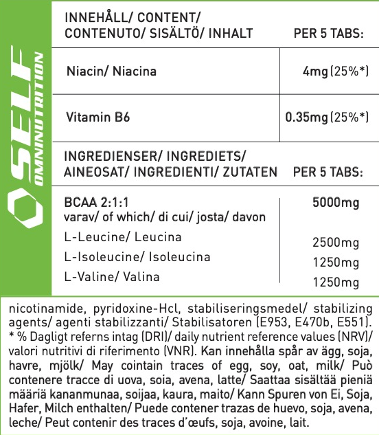 SELF Omninutrition Essential BCAA 211 ger dig en måldos av grenade aminosyror (BCAA) i form av lätta att svälja tabletter. BCAA är essentiella aminosyror, vilket betyder att de inte kan produceras av kroppen och därför behövs via kosten. De grenade aminosyrorna främjar muskeltillväxt och förhindrar också muskelnedbrytning, så bcaa-aminosyratillskott är särskilt önskvärda för idrottare. Bekvämt i tablettform, ger Essential BCAA 211 dig möjligheten att njuta av en dos "byggstenar" när som helst och var som helst. Ta det med dig till jobbet, bilen, resan etc. och se till att du får de aminosyror du behöver när du behöver dem mest.
