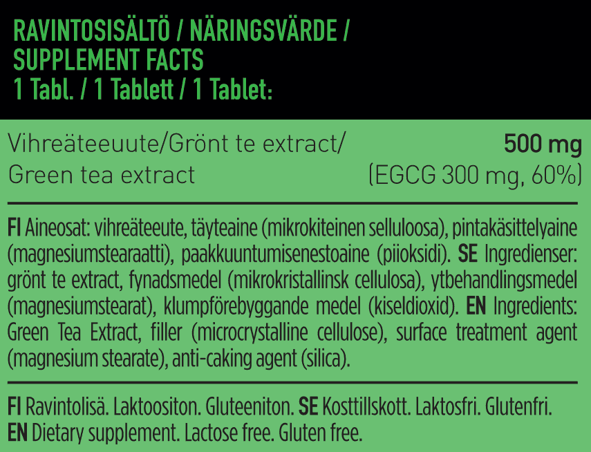 Strong Green Tea Extract innehåller extrakt av grönt te som är allmänt känt för sina fördelaktiga hälsoeffekter. Extraktet innehåller EGCG (epigallokatekingallat), som är en kraftig antioxidant. Strong Green Tea Extract har också termogena egenskaper som bidrar till att öka ämnesomsättningens aktivitet. Därtill stimulerar extraktet blodcirkulationssystemet. Strong Green Tea Extract lämpar sig utmärkt för viktkontroll och som stöd för den allmänna hälsan.