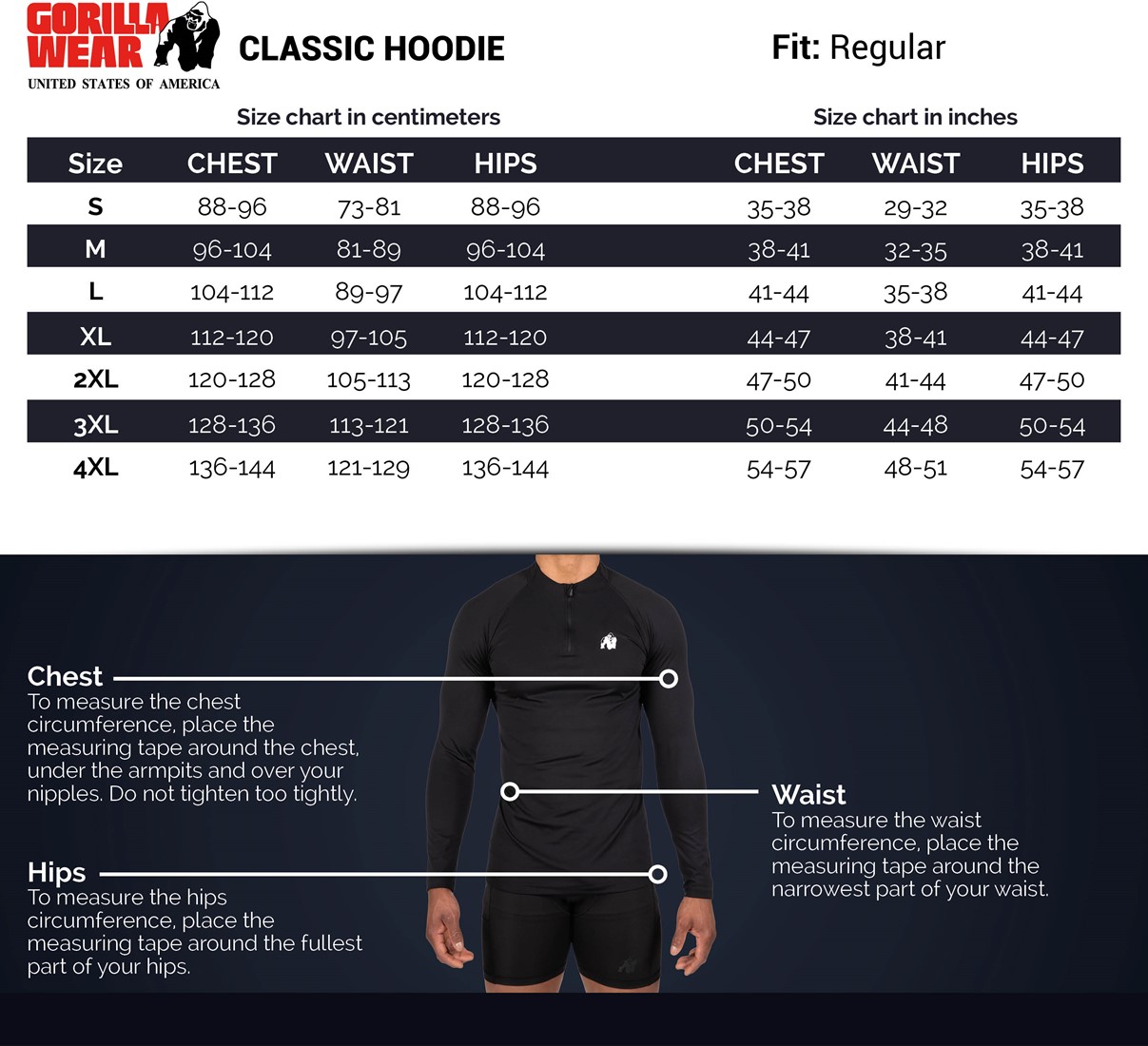 Gorilla Wear Classic Hoodie, namnet säger allt. Denna klassiska munkjacka har den klassiska Gorilla Wear-logotypen. Denna multifunktionella hoodie är lämplig för alla typer av situationer, oavsett om du är på gymmet, tränar utomhus eller njuter av dina lediga dagar. En blandning av bomull och elastan säkerställer komfort, flexibilitet och optimal rörlighet. Classic Hoodie har en huva med dragsko, elastiska ribbade muddar och, naturligtvis, den klassiska Gorilla Wear-logotypen på bröstet.